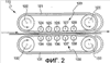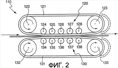 Нижняя половина имеет такую же конструкцию, как и верхняя половина, и содержит вторую ленту 131, третий шкив 132, четвертый шкив 133 и сжимающие ролики 134, 135, 136, 137, 138. Вторая лента 131 имеет мягкое резиновое внешнее покрытие и протекторный рисунок на внутренней поверхности, так же как первая лента. Третий шкив 132 и четвертый шкив 133 оба являются ведомыми и соединены с двигателем (не показан). Сжимающие ролики 134-138 могут свободно вращаться, их функция заключается в прижатии первой ленты к линейному компоненту 40 и улучшении таким образом сцепления между первой лентой и линейным компонентом. Оба набора сжимающих роликов 124-128 и 134-138 работают в направлении, по существу перпендикулярном направлению, в котором линейный компонент протягивается через устройство. В отличие от известной конструкции, устройство которой описано выше и изображено на фиг.1, эластичными выполнены обе ленты, первая 121 и вторая 131, и обе могут выдерживать значительное растяжение, например на 10-15%. Кроме того, второй и четвертый шкив 123, 133 могут быть смещены параллельно оси линейного компонента, для того чтобы растянуть соответственно первую и вторую ленты.