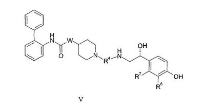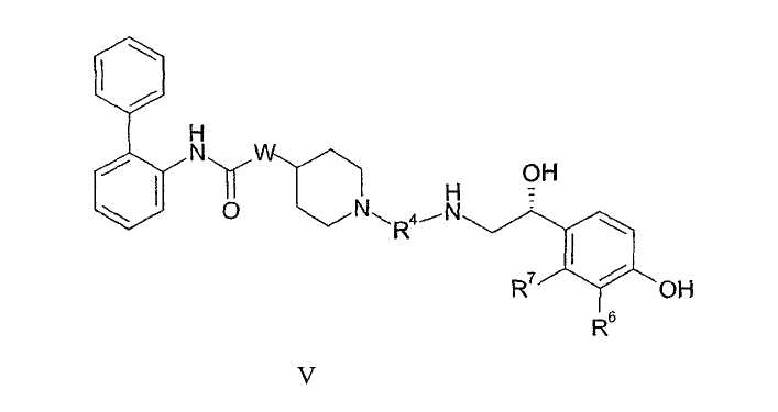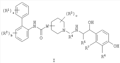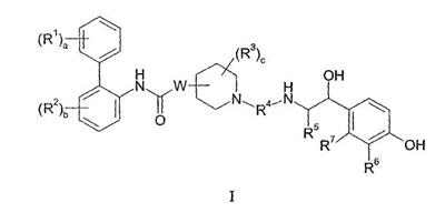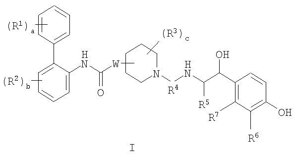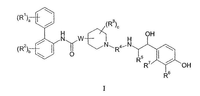Изобретение относится к новым соединениям формулы I: где: а представляет собой 0 или целое число от 1 до 3; каждый R1 независимо выбран из галогена; b представляет собой 0 или целое число от 1 до 3; каждый R2 независимо выбран из галогена; W присоединен в положении 3 или 4 относительно атома азота в пиперидиновом кольце и представляет собой О; с представляет собой 0 или целое число от 1 до 4; каждый R3 независимо выбран из (1-4С)алкила; или две группы R3 соединены вместе с образованием (1-3С)алкилена или оксиран-2,3-диила; R4 представляет собой двухвалентную группу формулы: -(R4a)d-(A1)e-(R4b)f-Q-(R4c)g-(A2)h-(R4d)i-, где d, e, f, g, h и i, каждый, независимо выбран из 0 и 1; R4a, R4b, R4c и R4d, каждый независимо выбран из (1-10С)алкилена, где каждая алкиленовая группа является незамещенной или замещена 1-5 заместителями, независимо выбранными из (1-4С)алкила, фтора и гидрокси; А1 и А2, каждый, независимо выбран из (3-7С)циклоалкилена, (6-10С)арилена, -О-(6-10С)арилена, (6-10С)арилен-О-, (2-9С)гетероарилена и (3-6С)гетероциклена, где каждый циклоалкилен является незамещенным или замещен 1-4 заместителями, независимо выбранными из (1-4С)алкила, и каждая ариленовая, гетероариленовая или гетероцикленовая группа является незамещенной или замещена 1-4 заместителями, независимо выбранными из галогена, (1-4С)алкила, (1-4С)алкокси, -S(O)2-(1-4С)алкила, гидрокси, нитро и трифторметокси; Q выбран из связи, -О-, -S(O)2-, -N(Qa)C(O)-, -C(O)N(Qb)-, -N(QC)S(O)2-, -S(O)2N(Qd)-, -N(Qe)C(O)N(Qf)- и -N(Qk); Qa, Qb, Qc, Qd, Qe, Qf и Qk, каждый, независимо выбран из водорода, (1-6С)алкила и А3, где алкильная группа является незамещенной или замещена 1-3 заместителями, независимо выбранными из фтора, гидрокси и (1-4С)алкокси; или вместе с атомом азота и группой R4b или R4c, к которым они присоединены, образуют 4-6-членную азациклоалкиленовую группу; А3 независимо выбран из (3-6С)циклоалкила, (6-10С)арила, (2-9С)гетероарила и (3-6С)гетероциклила, где каждый циклоалкил является незамещенным или замещен 1-4 заместителями, независимо выбранными из (1-4С)алкила, и каждая арильная, гетероарильная или гетероциклильная группа является незамещенной или замещена 1-4 заместителями, независимо выбранными из галогена, (1-4С)алкила и (1-4С)алкокси; при условии, что число смежных атомов в самой короткой цепи между двумя атомами азота, к которым присоединен R4, находится в интервале от 4 до 16; R5 представляет собой водород или (1-4С)алкил; R6 представляет собой -NR6aCR6b(O), и R7 представляет собой водород; или R6 и R7 вместе образуют -NR7aC(O)-CR7b=CR7c-; каждый из R6a и R6b независимо представляет собой водород или (1-4С)алкил; и каждый из R7a, R7b и R7c независимо представляет собой водород или (1-4С)алкил; или к его фармацевтически приемлемым солям, сольватам или стереоизомерам. Изобретение также относится к соединениям формулы I, к 1-[2-(2-хлор-4-{[(R)-2-гидрокси-2-(8-гидрокси-2-оксо-1,2-дигидрохинолин-5-ил)этиламино]метил}-5-метоксифенилкарбамоил)этил]пиперидин-4-иловому эфиру бифенил-2-илкарбаминовой кислоты или к его фармацевтически приемлемой соли или сольвату, к фармацевтической композиции, и к способу лечения легочного заболевания, способу обеспечения у пациента расширения просвета бронхов, способу лечения хронической обструктивной болезни легких или астмы, к способу получения соединения формулы I, к лекарственному средству, и к применению соединений по любому из пп.1, 13, 14, 24, 25, 26, 27 или 28. Технический результат – получение новых биологически активных соединений, обладающи
