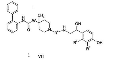 Другой частной группой соединений формулы I являются соединения формулы VII: где W, R4, R6 и R7 являются такими, как определено в таблице III, или их фармацевтически приемлемые соли, сольваты или стереоизомеры.