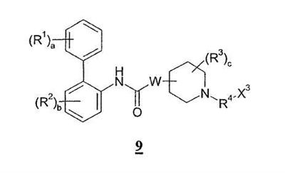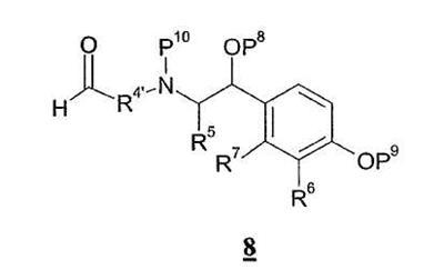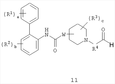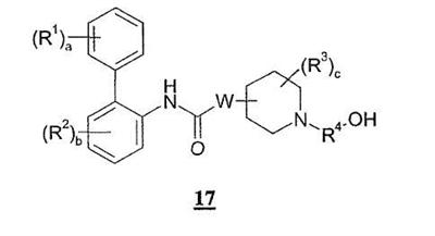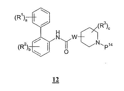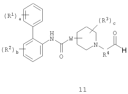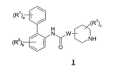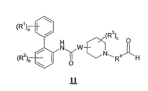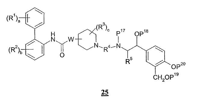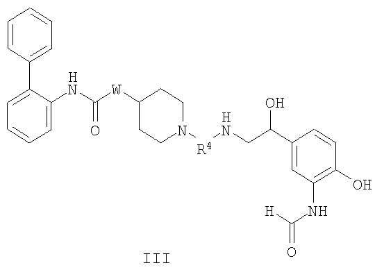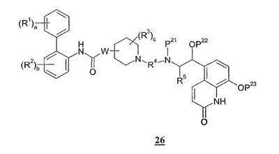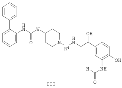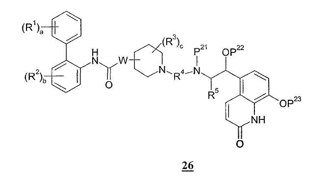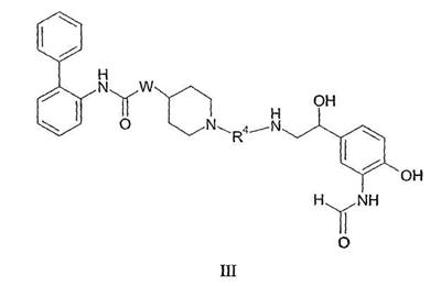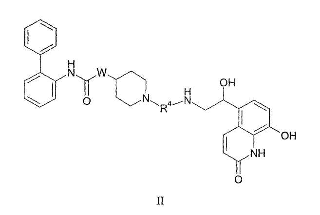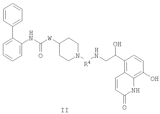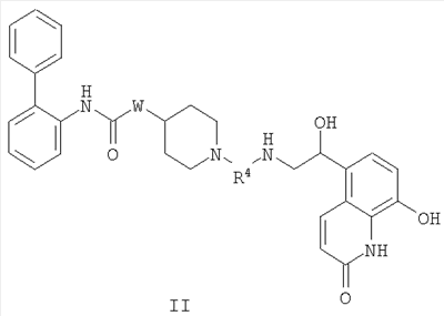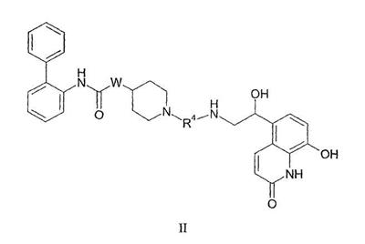Получение 99 1-[2-(4-[1,3]Диоксолан-2-илфенилкарбамоил)этил]-4-метилпиперидин-4-иловый эфир бифенил-2-илкарбаминовой кислоты Смесь 4-метилпиперидин-4-илового эфира бифенил-2-илкарбаминовой кислоты (2,73 г, 8,79 ммоль) и N-(4-[1,3]диоксолан-2-илфенил)акриламида (2,05 г, 8,80 ммоль) нагревали в 100 мл смеси (1:1) метанол/дихлорметан при 50°С в атмосфере азота в течение 1 ч. Затем раствор разбавляли этилацетатом и органический слой промывали водой, насыщенным раствором соли, сушили (MgSO4) и концентрировали при пониженном давлении с получением указанного в заголовке соединения. МС m/z вычислено для C31H35N3O5 (M+H)+ 530,6; найдено 530,4. Получение 100 1-[2-(4-формилфенилкарбамоил)этил]-4-метилпиперидин-4-иловый эфир бифенил-2-илкарбаминовой кислоты Продукт получения 99 повторно растворяли в 40 мл метанола и добавляли 25 мл водной 1н. хлористоводородной кислоты. Полученную смесь перемешивали при комнатной температуре в течение ночи и удаляли при пониженном давлении органический растворитель. Остаток растворяли в этилацетате и органический слой промывали водой, насыщенным раствором соли, сушили (MgSO4) и удаляли при пониженном давлении растворитель. Продукт растирали в дихлорметане с получением указанного в заголовке соединения в виде белого порошка (2,47 г). ЖХ-МС (2-90) Rt=4,27 мин; МС m/z вычислено для C29H31N3O4 (M+H)+ 486,6; найдено 486,5. Получение 101 1-[2-(4-{[(R)-2-(трет-Бутилдиметилсиланилокси)-2-(8-гидрокси-2-оксо-1,2-дигидрохинолин-5-ил)этиламино]метил}фенилкарбамоил)этил]-4-метилпиперидин-4-иловый эфир бифенил-2-илкарбаминовой кислоты Смесь продукта получения 100 (1,70 г, 3,51 ммоль) и 5-[(R)-2-амино-1-(трет-бутилдиметилсиланилокси)этил]-8-гидрокси-1Н-хинолин-2-онацетата (1,65 г, 4,19 ммоль) в 40 мл смеси (1:1) метанола и дихлорметана перемешивали при комнатной температуре в течение ночи. Затем добавляли одной порцией триацетоксиборогидрид натрия (2,23 г, 10,5 ммоль) и реакционную смесь перемешивали при комнатной температуре в течение 6 ч. Далее реакционную смесь гасили водой и разбавляли этилацетатом. Разделяли слои и органический слой промывали насыщенным раствором бикарбоната натрия, насыщенным раствором соли, сушили (MgSO4) и удаляли при пониженном давлении растворитель с получением указанного в заголовке соединения (2,9 г). МС m/z вычислено для C46H57N5O6Si (M+H)+ 805,0; найдено 804,6. Пример 170 1-[2-(4-{[(R)-2-Гидрокси-2-(8-гидрокси-2-оксо-1,2-дигидрохинолин-5-ил)этиламино]метил}фенилкарбамоил)этил]-4-метилпиперидин-4-иловый эфир бифенил-2-илкарбаминовой кислоты Продукт получения 101 (2,9 г, 3,6 ммоль) растворяли в 75 мл дихлорметана и добавляли тригидрофторид триэтиламина (0,85 мл, 5,2 ммоль). Полученную смесь перемешивали при комнатной температуре в течение ночи и затем удаляли при пониженном давлении растворитель с получением неочищенного продукта в виде масла. Продукт затем растворяли в смеси (1:1) уксусная кислота/вода и очищали препаративной ВЭЖХ с получением указанного в заголовке соединения в виде не совсем белого твердого вещества. ЖХ-МС (2-90) Rt=3,67 мин; МС m/z вычислено для C40H43N5O6 (M+H)+ 690,8; найдено 690,3. Используя описанные выше методики и соответствующие исходные вещества, получали следующие соединения.