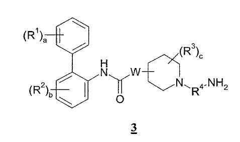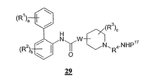 1. Соединение формулы I где а представляет собой 0 или целое число от 1 до 3; каждый R1 независимо выбран из галогена; b представляет собой 0 или целое число от 1 до 3; каждый R2 независимо выбран из галогена; W присоединен в положении 3 или 4 относительно атома азота в пиперидиновом кольце и представляет собой О; с представляет собой 0 или целое число от 1 до 4; каждый R3 независимо выбран из (1-4С)алкила; или две группы R3 соединены вместе с образованием (1-3С)алкилена или оксиран-2,3-диила; R4 представляет собой двухвалентную группу формулы: где d, e, f, g, h и i, каждый независимо выбран из 0 и 1; R4a, R4b, R4c и R4d, каждый независимо выбран из (1-10С)алкилена, где каждая алкиленовая группа является незамещенной или замещена 1-5 заместителями, независимо выбранными из (1-4С)алкила, фтора и гидрокси; А1 и А2, каждый независимо выбран из (3-7С)циклоалкилена, (6-10С)арилена, -О-(6-10С)арилена, (6-10С)арилен-О-, (2-9С)гетероарилена и (3-6С)гетероциклена, где каждый циклоалкилен является незамещенным или замещен 1-4 заместителями, независимо выбранными из (1-4С)алкила, и каждая ариленовая, гетероариленовая или гетероцикленовая группа является незамещенной или замещена 1-4 заместителями, независимо выбранными из галогена, (1-4С)алкила, (1-4С)алкокси, -S(O)2-(1-4С)алкила, гидрокси, нитро и трифторметокси; Q выбран из связи, -О-, -S(O)2-, -N(Qa)C(O)-, -C(O)N(Qb)-, -N(Qc)S(O)2-, -S(O)2N(Qd)-, -N(Qe)C(O)N(Qf)- и -N(Qk); Qa, Qb, Qc, Qd, Qe, Qf и Qk, каждый независимо выбран из водорода, (1-6С)алкила и А3, где алкильная группа является незамещенной или замещена 1-3 заместителями, независимо выбранными из фтора, гидрокси и (1-4С)алкокси; или вместе с атомом азота и группой R4b или R4c, к которым они присоединены, образуют 4-6-членную азациклоалкиленовую группу; А3 независимо выбран из (3-6С)циклоалкила, (6-10С)арила, (2-9С)гетероарила и (3-6С)гетероциклила, где каждый циклоалкил является незамещенным или замещен 1-4 заместителями, независимо выбранными из (1-4С)алкила, и каждая арильная, гетероарильная или гетероциклильная группа является незамещенной или замещена 1-4 заместителями, независимо выбранными из галогена, (1-4С)алкила и (1-4С)алкокси; при условии, что число смежных атомов в самой короткой цепи между двумя атомами азота, к которым присоединен R4, находится в интервале от 4 до 16; R5 представляет собой водород или (1-4С)алкил; R6 представляет собой -NR6aCR6b(O), и R7 представляет собой водород; или R6 и R7 вместе образуют -NR7aC(O)-CR7b=CR7c-; каждый из R6a и R6b независимо представляет собой водород или (1-4С)алкил; и каждый из R7a, R7b и R7c независимо представляет собой водород или (1-4С)алкил; или его фармацевтически приемлемая соль, сольват или стереоизомер. 2. Соединение по п.1, где число смежных атомов в самой короткой цепи между двумя атомами азота, к которым присоединен R4, находится в пределах от 8 до 14. 3. Соединение по п.2, где число смежных атомов в самой короткой цепи между двумя атомами азота, к которым присоединен R4, составляет 8, 9, 10 или 11. 4. Соединение по п.1, где W присоединен к пиперидиновому кольцу в положении 4 относительно атома азота. 5. Соединение по п.1, где каждый из a, b и с равен 0, и R5 представляет собой водород. 6. Соединение по п.1, где R6 представляет собой -NHCHO и R7 представляет собой водород, или R6 и R7 вместе образуют -NHC(O)-СН=СН-. 7. Соединение по п.1, где R представляет собой двухвалентную группу формулы -(R4a)d-, где R4a представляет собой (4-10С)алкилен. 8. Соединение по п.7, где R4 представляет собой -(СН2)8-, -(СН2)9– и -(СН2)10-. 9