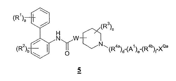 Описание Предпосылки создания изобретения Область техники, к которой относится изобретение Настоящее изобретение относится к новым производным бифенила, полезным для лечения легочных заболеваний. Данное изобретение относится также к фармацевтическим композициям, содержащим указанные производные бифенила, способам и промежуточным соединениям для получения таких производных бифенила и способам применения указанных производных бифенила для лечения болезней легких. Состояние уровня техники Болезни легких, такие как астма и хроническая обструктивная болезнь легких (ХОБЛ; COPD), обычно лечат бронхолитическими средствами. Один класс широко применяемых бронхолитических средств состоит из агонистов Известны также применяемые для лечения болезней легких фармацевтические композиции, содержащие как агонист Соединения, обладающие активностью или агониста Краткое описание изобретения В соответствии с настоящим изобретением предлагаются новые производные бифенила, полезные для лечения легочных заболеваний. Помимо других свойств, соединения настоящего изобретения обладают, как было установлено, активностью как агониста Таким образом, в одном из его аспектов, касающихся структуры соединения, настоящее изобретение относится к соединению формулы I: где: а представляет собой 0 или целое число от 1 до 3; каждый R1 независимо выбран из (1-4C)алкила, (2-4C)алкенила, (2-4C)алкинила, (3-6C)циклоалкила, циано, галогена, -OR1a, -C(O)OR1b, -SR1c, -S(O)R1d, -S(O)2R1e и -NR1fR1g; каждый из R1a, R1b, R1c, R1d, R1e, R1f и R1g независимо представляет собой водород, (1-4C)алкил или фенил-(1-4C)алкил; b представляет собой 0 или целое число от 1 до 3; каждый R2 независимо выбран из (1-4C)алкила, (2-4C)алкенила, (2-4C)алкинила, (3-6C)циклоалкила, циано, галогена, -OR2a, -C(О)OR2b, -SR2c, -S(О)R2d, -S(O)2R2e и -NR2fR2g; каждый из R2a, R2b, R2c, R2d, R2e, R2f и R2g независимо представляет собой водород, (1-4C)алкил или фенил-(1-4C)алкил; W присоединен в положении 3 или 4 в пиперидиновом кольце и представляет собой O или NWa; Wa представляет собой водород или (1-4C)алкил; c представляет собой 0 или целое число от 1 до 4; каждый R3 независимо выбран из (1-4C)алкила, (2-4C)алкенила, (2-4C)алкинила, (3-6C)циклоалкила, циано, галогена, -OR3a, -C(O)OR3b, -SR3c, -S(O)R3d, -S(O)2R3e и -NR3fR3g; или две группы R3 соединены вместе с образованием (1-3C)алкилена, (2-3C)алкенилена или оксиран-2,3-диила; каждый из R3a, R3b, R3c, R3d, R3e, R3f и R3g независимо представляет собой водород или (1-4C)алкил; R4 представляет собой двухвалентную группу формулы: -(R4а)d-(А1)е-(R4b)f-Q-(R4c)g-(A2)h-(R4d)i– где d, e, f, g, h и i, каждый, независимо выбран из 0 и 1; R4a, R4b, R4c и R4d, каждый, независимо выбран из (1-10C)алкилена, (2-10С)алкенилена и (2-10C)алкинилена, где каждая алкиленовая, алкениленовая или алкиниленовая группа является незамещенной или замещена 1-5 заместителями, независимо выбранными из (1-4C)алкила, фтора, гидрокси, фенила и фенил-(1-4C)алкила; A1 и A2, каждый, независимо выбран из (3-7C)циклоалкилена, (6-10)арилена, -O-(6-10C)арилена, (6-10C)арилен-O-, (2-9C)гетероарилена, -O-(2-9C)гетероарилена, (2-9C)гетероарилен-O- и (3-6C)гетероциклена, где каждый циклоалкилен является незамещенным или замещен 1-4 заместителями, независимо выбранными из (1-4C)алкила, и каждая ариленовая, гетероариленовая или гетероцикленовая группа является незамещенной или замещена 1-4 заместителями, независимо выбранными из галогена, (1-4C)алкила, (1-4C)алкокси, -S-(1-4C)алкила, -S(O)-(1-4C)алкила, -S(O)2-(1-4C)алкила, -С(О)О(1-4C)алкила, карбокси, циано, гидрокси, нитр