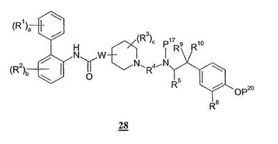 где Р11 и Р12, каждый независимо представляет собой атом водорода или гидроксилзащитную группу, и Р13 представляет собой атом водорода или аминозащитную группу; в присутствии восстановителя; и затем удаление какой-либо защитной группы Р11, Р12 или Р13 с образованием соединения формулы I. 36. Способ по 35, который дополнительно включает стадию образования фармацевтически приемлемой соли соединения формулы I. 37. Соединение по любому из пп.1, 13, 14, 24, 25, 26, 27 или 28 для применения в качестве лекарственного средства для лечения легочного заболевания. 38. Соединение по любому из пп.1, 13, 14, 24, 25, 26, 27 или 28 для лечения легочного заболевания. 39. Лекарственное средство, обладающее как активностью антагониста мускариновых рецепторов, так и активностью агониста 40. Применение соединения по любому из пп.1, 13, 14, 24, 25, 26, 27 или 28 для изготовления лекарственного средства для лечения легочного заболевания. 41. Применение соединения по любому из пп.1, 13, 14, 24, 25, 26, 27 или 28 для лечения легочного заболевания. 42. Применение по п.40 или 41, где легочное заболевание представляет собой хроническую обструктивную болезнь легких или астму. Приоритет по пунктам: 01.05.2003 по пп.1-23, 25-42; 14.02.2003 по п.24.