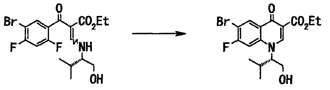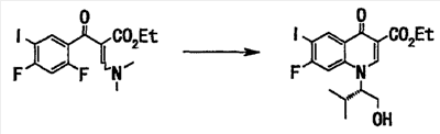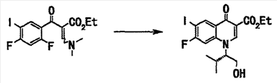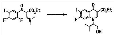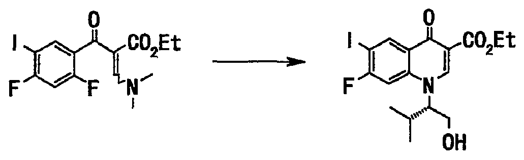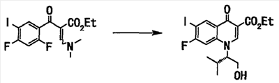 Неочищенный продукт (210 г) со стадии 2 растворяли в тетрагидрофуране (500 мл), добавляли (S)-(+)-валинол (54 г, 521 ммоль), и смесь перемешивали при комнатной температуре 30 минут. Реакционную смесь концентрировали при пониженном давлении и остаток растворяли в диметилформамиде (600 мл). Добавляли карбонат калия (144 г, 1,04 моль) и смесь перемешивали при нагревании до 70°С в течение 2 часов. Реакционную смесь оставляли для остывания, добавляли к воде (1500 мл) и перемешивали. Выпавшее в осадок твердое вещество отделяли фильтрованием и полученное твердое вещество последовательно промывали 30% водным этанолом (500 мл) и смесью растворителей: диэтилового эфира (150 мл) и гексана (150 мл) и сушили в вакууме, получали этиловый эфир 7-фтор-1-((S)-1-гидроксиметил-2-метилпропил)-6-иод-4-оксо-1,4-дигидрохинолин-3-карбоновой кислоты (178 г, выход 76%) в виде твердого вещества бежевого цвета.