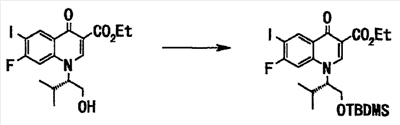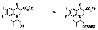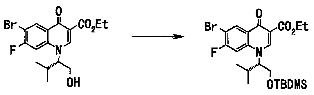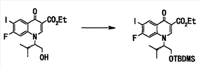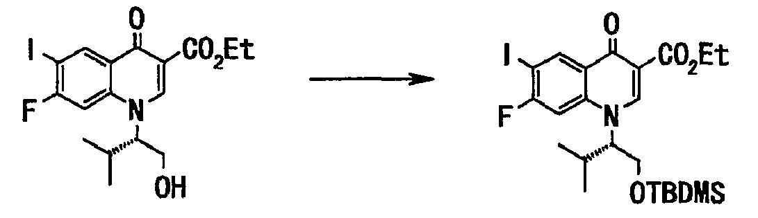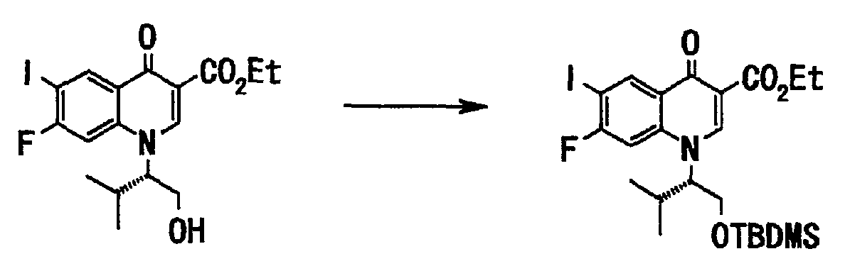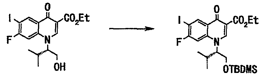Соединение (80 г, 179 ммоль), полученное на стадии 3, растворяли в диметилформамиде (320 мл), добавляли имидазол (16 г, 233 ммоль) и трет-бутилдиметилсилилхлорид (30 г, 197 ммоль), и смесь перемешивали при комнатной температуре в течение 1,5 часов. К реакционной смеси добавляли воду и смесь экстрагировали этилацетатом. Органический слой последовательно промывали насыщенным водным раствором хлорида аммония и насыщенным солевым раствором и сушили над сульфатом натрия. Органический слой отфильтровывали и фильтрат концентрировали при пониженном давлении. Полученный остаток очищали хроматографией на силикагеле (этилацетат:гексан = 1:3 до 1:2) с получением этилового эфира 1-((S)-1-трет-бутилдиметилсилилоксиметил-2-метилпропил)-7-фтор-6-иод-4-оксо-1,4-дигидрохинолин-3-карбоновой кислоты (77 г, выход 77%) в виде бесцветного вещества в аморфной форме.