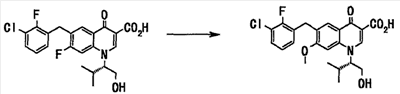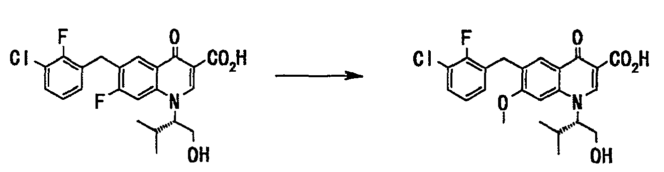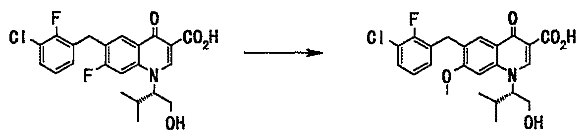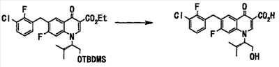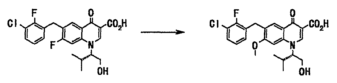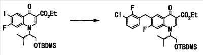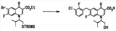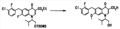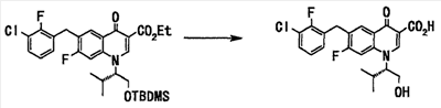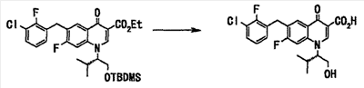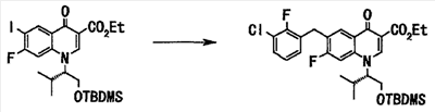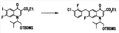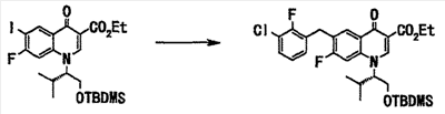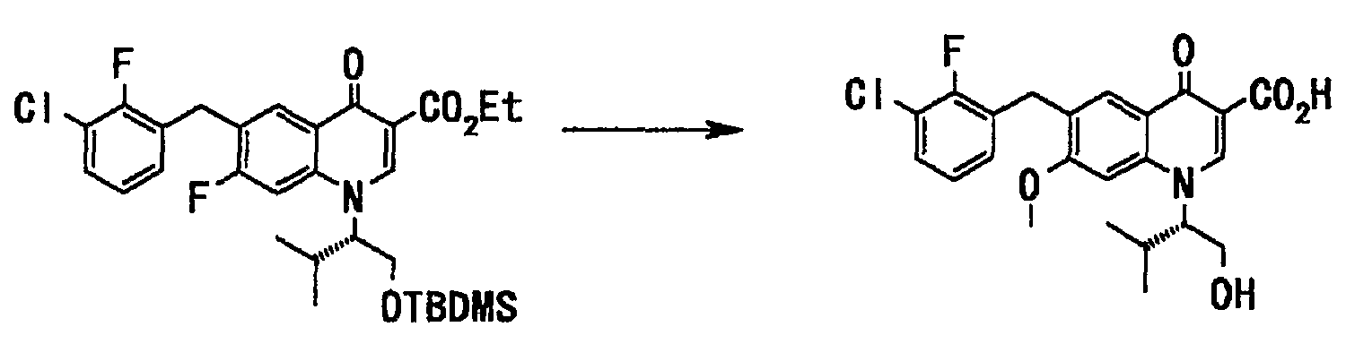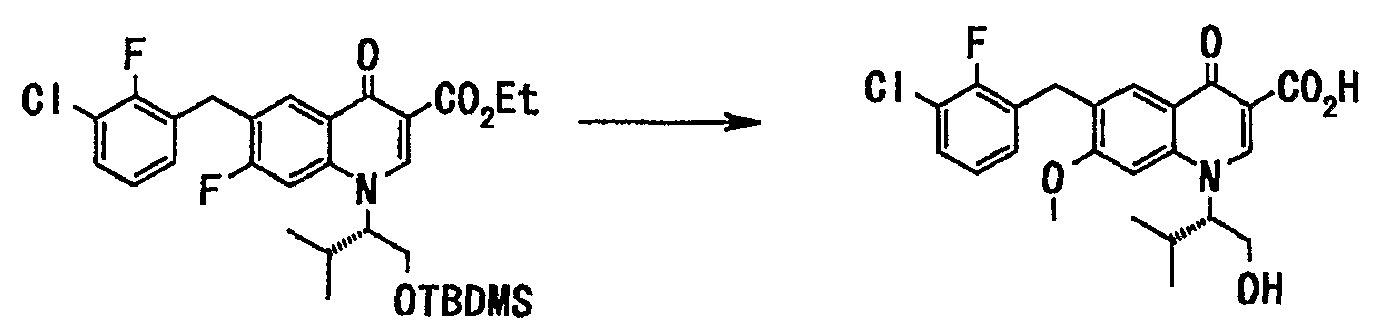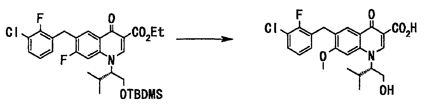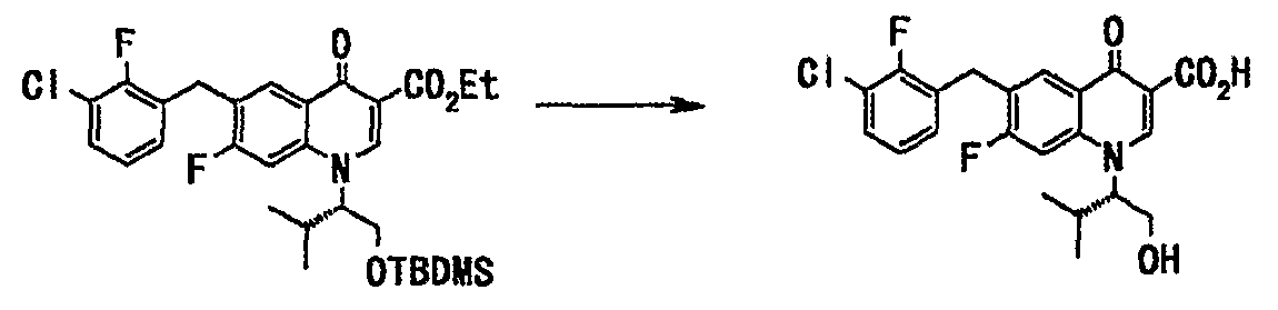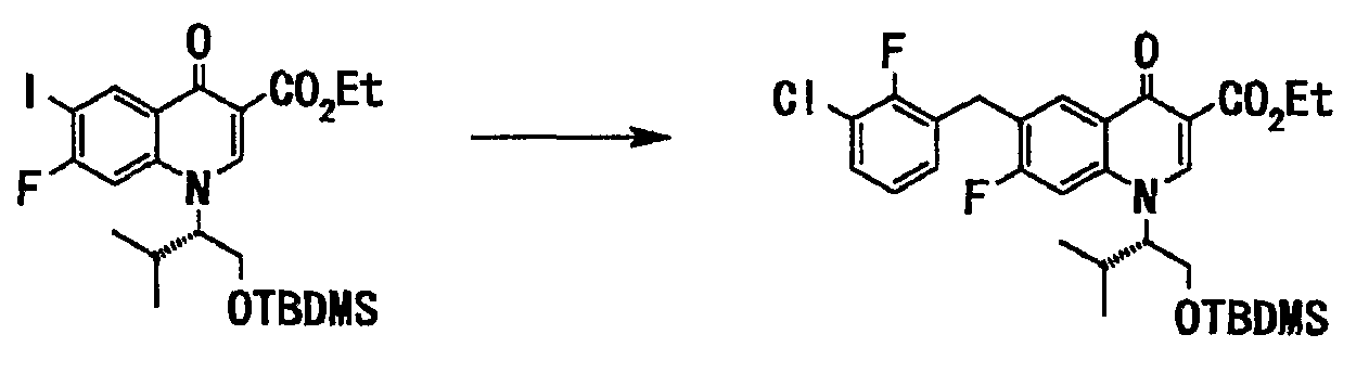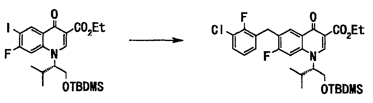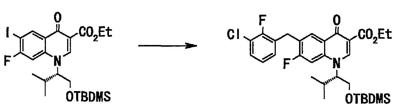 Соединение (76 г, 136 ммоль), полученное на стадии 4, растворяли в тетрагидрофуране (600 мл), и в токе аргона добавляли дибензилиденацетонпалладий (II) (3,2 г, 5,5 ммоль) и трифурилфосфин (2,6 г, 11,0 ммоль), и по каплям добавляли вышеупомянутый раствор 1М 3-хлор-2-фторбензилцинкбромид в тетрагидрофуране (178 мл, 178 ммоль) при 60°С. После завершения прикапывания смесь перемешивали с нагреванием до той же температуры в течение 2 часов. Реакционную смесь оставляли для охлаждения до комнатной температуры, добавляли насыщенный водный раствор хлорида амммония, и фильтровали смесь через целит. Фильтрат дважды экстрагировали этилацетатом. Органический слой последовательно промывали водой (дважды) и насыщенным солевым раствором и сушили над сульфатом магния. Органический слой отфильтровывали и фильтрат концентрировали при пониженном давлении, и полученный остаток очищали хроматографией на силикагеле (хлороформ:ацетон = 40:1) с получением этилового эфира 1-((S)-1-трет-бутилдиметилсилилоксиметил-2-метилпропил)-6-(3-хлор-2-фторбензил)-7-фтор-4-оксо-1,4-дигидрохинолин-3-карбоновой кислоты (68 г, выход 84%) в виде бесцветного вещества в аморфной форме.