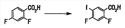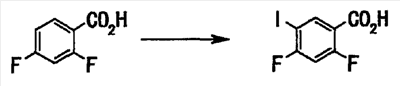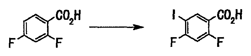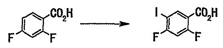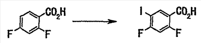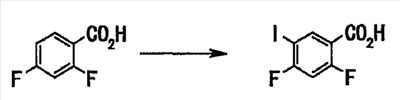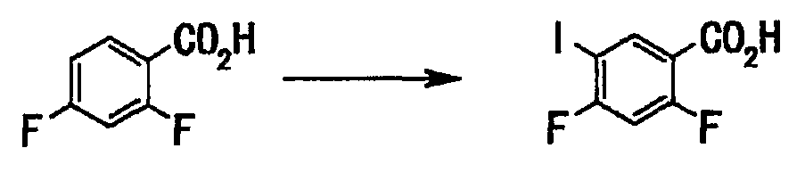 2,4-Дифторбензойную кислоту (50 г, 316 ммоль) растворяли в концентрированной серной кислоте (200 мл) и порциями добавляли N-иодсукцинимид (68 г, 300 ммоль) при температуре, не превышающей 5°С. После завершения добавления смесь перемешивали при той же температуре 4,5 часа. Реакционную смесь выливали в ледяную воду (приблизительно 600 мл), затем добавляли 10% водный раствор сульфита натрия, и смесь перемешивали. Выпавший твердый осадок отделяли фильтрованием, промывали водой и сушили в вакууме с получением неочищенных кристаллов (85 г). Неочищенные кристаллы, полученные подобным образом, объединяли (получали их общее количество 205 г) и перекристаллизовывали из 50% водного этанола (820 мл) с получением 2,4-дифтор-5-иодбензойной кислоты (148 г, выход 73%) в виде твердого вещества белого цвета.