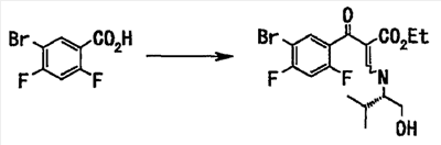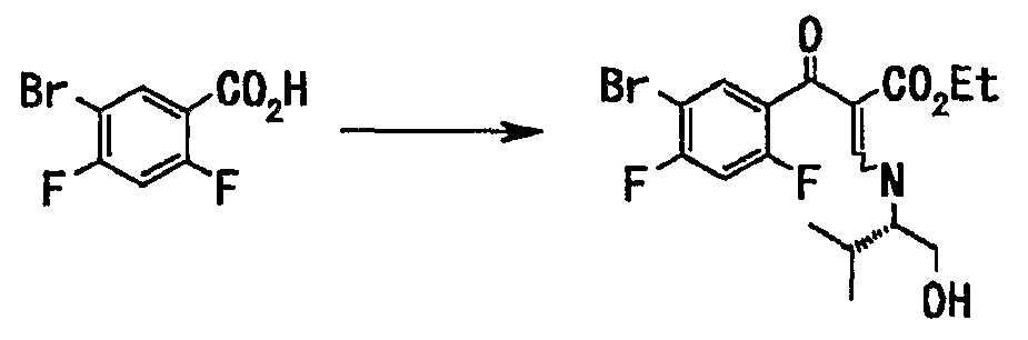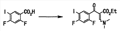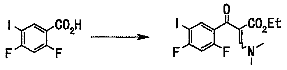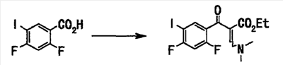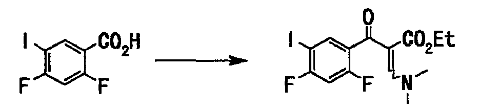 Соединение (148 г, 521 ммоль), полученное на стадии 1, растворяли в толуоле (750 мл), добавляли тионилхлорид (76 мл, 1,04 моль) и диметилформамид (каталитические количества), смесь нагревали с обратным холодильником в течение 2 часов. Нерастворившееся вещество отфильтровывали при 60°С, и фильтрат концентрировали при пониженном давлении и отгоняли азеотроп с толуолом (330 мл). Остаток растворяли в тетрагидрофуране (400 мл), и этот раствор по каплям добавляли к раствору этил-3,3-диметиламиноакрилата (82 г, 573 ммоль) и триэтиламина (87 мл, 625 ммоль) в тетрагидрофуране (400 мл), и смесь нагревали с обратным холодильником в течение 7 часов. Реакционную смесь оставляли для остывания до комнатной температуры и концентрировали при пониженном давлении. Добавляли воду (700 мл) и этилацетат (800 мл) для разделения. Органический слой последовательно промывали насыщенным водным раствором гидрокарбоната натрия (250 мл × 2), водой (300 мл) и насыщенным солевым раствором (300 мл) и сушили над сульфатом натрия. После отфильтровывания нерастворимого вещества фильтрат концентрировали при пониженном давлении с получением неочищенного вещества (210 г), этилового эфира 2-(2,4-дифтор-5-иодбензоил)-3-диметиламиноакриловой кислоты в виде твердого вещества коричневого цвета.