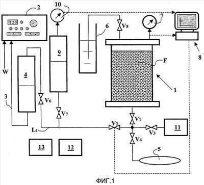 Устройство для оценки физических параметров подземного месторождения полезных ископаемых, схематически представленное на фиг.1, содержит камеру 1 удержания, в которую сначала вводят фрагменты полученной при бурении породы. Система 2 впрыскивания жидкости сообщается при помощи трубопровода 3 с основанием буферного резервуара 4, содержащего некоторую более или менее вязкую жидкость, адаптированную к подлежащей измерению проницаемости, например масло. Противоположный конец буферного резервуара 4 сообщается при помощи клапана V6 с линией L1. Первый конец камеры 1 удержания сообщается с линией L1 при помощи двух клапанов V1, V2. Противоположный конец камеры 1 удержания сообщается при помощи клапана V5 изолирования с сепаратором 6. Манометр 7 присоединен к выходной части камеры 1 удержания. Изменения давления, измеренные манометром 7, регистрируются запоминающими средствами микропроцессора 8. Клапан V2 управляется непосредственно микропроцессором 8. Линия L1 также сообщается через клапан V7 с резервуаром 9, содержащим более или менее вязкую жидкость, находящуюся под определенным давлением при помощи газового колпака под давлением, гибкой мембраны или способного перемещаться элемента. Манометр 10 присоединен к выходной части резервуара 9. Изменения давления, которые измеряет манометр, также регистрируются микропроцессором 8.
