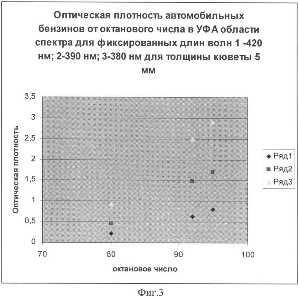 при этом октановое число определяют по калибровочной кривой, связывающей значения оптической плотности бензина с соответствующим значением октанового числа бензина.