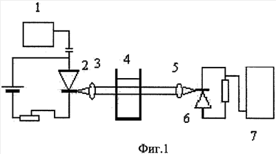 Способ осуществляется следующим образом. В полупроводниковом инжекционном светодиоде или лазерном диоде 2 устанавливают ток инжекции в рабочем диапазоне, с помощью генератора 1 производят импульсную 100% модуляцию тока инжекции в низкочастотной области и соответственно модуляцию оптической мощности светодиода или лазерного диода, с помощью микролинзы 3 формируют параллельный оптический пучок, просвечивающий кювету 4 с анализируемым бензином. Оптический пучок, прошедший кювету с бензином, фокусируется микролинзой 5 и детектируется с помощью фотодиода 6. На основе измерения переменной составляющей фототока, пропорциональной оптической интенсивности прошедшего излучения, с помощью аналого-цифрового преобразователя и микропроцессора 7 в соответствии с соотношением (1) определяется коэффициент поглощения или оптическая плотность, при этом предварительно на этапе калибровки определяется уровень входного оптического излучения, т.е измерения при отсутствии кюветы, уровень прошедшего оптического излучения, когда кювета пустая и наполненная анализируемым бензином, а далее вычисляется октановое число, используя калибровочную кривую.