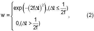 Однако траектории, определяемые зоной (200) Френеля, могут быть уточнены путем присвоения значений весовых коэффициентов в отдельных узловых точках сетки. Для уточнения траекторий путем присвоения значений весовых коэффициентов выбирают надлежащую весовую функцию. Например, может быть выбрано экспоненциальное значение весового коэффициента, уменьшающееся от 1 до 0 по экспоненте при увеличении измеренной временной задержки распространения волны согласно приведенному ниже уравнению: