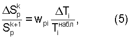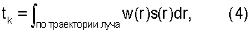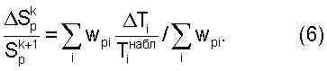 Скорректированная величина обратная скорости волны, в р-й узловой точке сетки при k-й итерации и погрешность времени пробега i-х лучей выражаются следующими уравнениями: