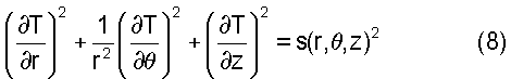 Ниже приведено описание формульного представления уравнения эйконала в цилиндрических координатах на основании алгоритма быстрой прогонки. Средства решения уравнения эйконала представляют собой примеры того, каким образом следует решать использованные математические выражения согласно некоторым аспектам настоящего изобретения, однако также может быть использован иной способ решения соответствующих математических уравнений. Выражение для уравнения эйконала в цилиндрических координатах имеет следующий вид: