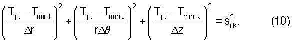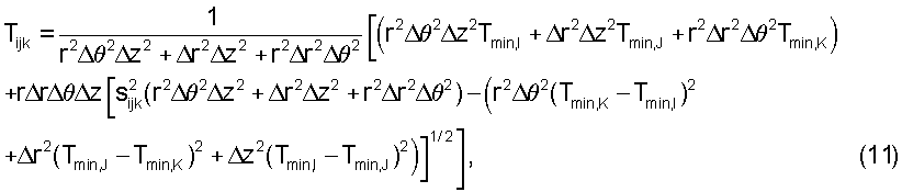 Томограммы величины, обратной скорости волны, восстановленные с использованием способа обратного проецирования, также могут быть использованы в конфигурации для получения трехмерной томограммы. Для облегчения трехмерного восстановления может быть использовано средство решения уравнения эйконала. Полезным является средство решения цилиндрического уравнения эйконала, поскольку данные акустического каротажа измерены вокруг буровой скважины. Известный из предшествующего уровня техники способ быстрой прогонки был реализован в декартовых и в сферических координатах. В настоящем изобретении способ быстрой прогонки, представленный в виде формул, был распространен на трехмерные (3-D) цилиндрические координаты. Описание формул приведено ниже.