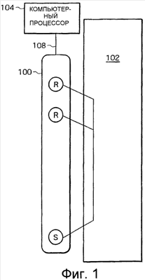 Теперь приведено описание чертежей и, в частности, чертежа Фиг.1, на котором показано устройство (100) акустического каротажа, расположенное рядом с однородным пластом (102). Устройство (100) акустического каротажа содержит источник (S) и, по меньшей мере, один приемник (R). В настоящем варианте осуществления изобретения имеется два приемника (R), однако также может быть использовано намного большее количество приемников (R) и источников (S). Показанный на чертеже вариант компоновки с одним источником (S) и двумя приемниками (R), по существу, приведен лишь в качестве примера, и может иметь место вариант с полным набором приемников и/или источников. Приемники (R) и источник (S) соединены с компьютерным процессором (104), служащим для сбора и обработки данных, поступающих из устройства (100) акустического каротажа. Также показана траектория (106) сейсмического луча, представляющая собой траекторию волны сжатия, вызванной приведением в действие источника (S). Приемники (R) могут представлять собой приемники различных типов, в том числе, пьезоэлектрические и магниторестриктивные приемники, но эти примеры не являются ограничивающим признаком. Приемники (R) способны обнаруживать вступление акустических волн.