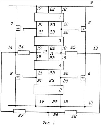 Работает УМИС следующим образом. Уровень сигнала, соответствующий числу Ч1, подают на вход 11 (или 12), а на вход 12 (или 11) подают уровень сигнала, который соответствует числу Ч2. Входные сигналы поступают со входов 11 и 12 (фиг.1) на входы 18 и 19 токовых зеркал 3 и 4, через выходы 20 и 21 которых передаются к управляющим электродам, выходных комплементарных транзисторов 5, 6 и 7, 8. В итоге на нагрузке 27 и 28, которая подключена к предварительным выходам 13 и 14 (между точками соединения выходных транзисторов), образуется суммированный итоговый сигнал (ИС) на выходе 26, который соответствует числу результата с противоположным (инвертированным) знаком. Полная таблица истинности УМИС приведена в таблице.