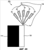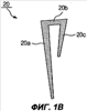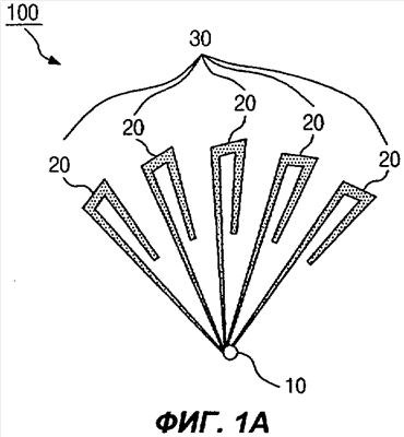На фиг.1В: каждый из излучательных компонентов 20 включает в себя первый излучательный элемент 20а, соединенный с фидерной линией посредством блока 10 крепления; второй излучательный элемент 20b соединен с одним концом первого излучательного элемента 10 и образует с ним угол от 0 до 180 градусов; третий излучательный элемент 20с соединен со вторым излучательным элементом 20b и образует с ним угол от 0 до 180 градусов. Каждый из излучательных компонентов 20с относительно узок на внутреннем краю и расширяется к внешнему краю.