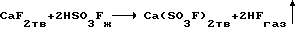 Пример 2. Сыпучий продукт, полученный на предыдущей стадии, загружали в верхнюю часть вертикального аппарата провального типа длиной 2000 мм и диаметром 20 мм при производительности 1,2 кг/ч. Так же, как и на предыдущей стадии, по противоточной схеме снизу подавали пары воды в количестве 100% относительно стехиометрии. Температуру реактора и реагентов поддерживали в пределах 180 2oC. Время падения частичек фторсульфоната кальция составляло 8-10 с. При анализе твердой фазы было установлено, что степень гидролиза составила 95%.