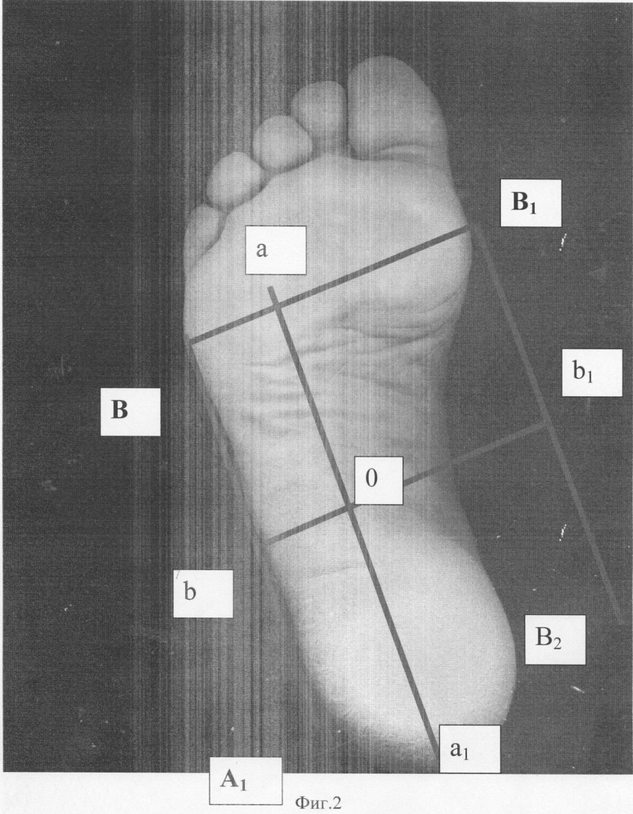 Способ диагностики состояния отделов стопы путем снятия отпечатков подошвенной поверхности стоп и последующей их обработки графико-расчетным методом, включающим выделение ключевых точек стопы, отличающийся тем, что производят ручную расстановку координатных точек и прямых: точку В, соответствующую головке пятой плюсневой кости, точку А1 – точку пяточного угла, проводят прямую ВА1, соединяющую эти точки; выделяют точку В1, соответствующую головке первой плюсневой кости и проводят прямую ВВ1; устанавливают точку О на границе соприкосновения с опорой внутреннего контура свода стопы, проводят прямую аа1 через точку О параллельно линии ВА1; проводят прямую В1В2 через точку В1 параллельно ВА1, проводят прямую bbl через точку О параллельно ВВ1, измеряют длину bb1 и bO; вычисляют отношение (D) длины отрезков bO к bb1 в процентах; при D<=40% делают заключение «нормальная стопа»; при D>40% и D<=60% – заключение «уплощение стопы»; D>60% – заключение «плоская стопа».
