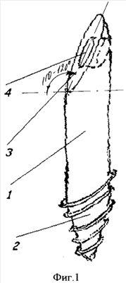 Стержень 1 из никелида титана имеет круглое сечение. Один конец стержня 1 имеет заостренную коническую форму с резьбой 2. Другой конец стержня 1 имеет скошенную под углом в 110-120° площадку 3. В площадке 3 выполнено сквозное отверстие 4 для введения зубного имплантата 5 в вертикальный канал 6. Стержень 1 вставляют в слепое отверстие, выполненное от места расположения утраченного зуба 7 к линии перелома 8 через отломок 9 с погружением в отломок 10. Стержень 1 вводят в слепое отверстие так, чтобы скошенная площадка 3 оказалась в месте утраченного зуба 7 в горизонтальном положении. В сквозное отверстие 4 и в вертикальный канал 6 вводят зубной имплантат 5, на который в дальнейшем навинчивают коронку.