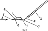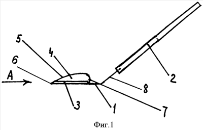 Острием 6 вскрывается конъюнктива. Далее дугообразной режущей кромкой 5 производят образование конъюнктивального и склерального лоскутов необходимой формы. При этом усилие резания направлено снизу вверх (изнутри наружу), что уменьшает деформации конъюнктивы и склеры.