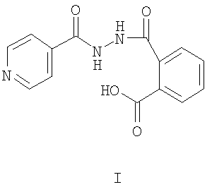 Заявляемое соединение представляет собой белое кристаллическое вещество, растворимое в воде, этаноле, ДМСО, ДМФА. В спектре ЯМР 1H (“РЯ-2310” (60 МГц) в ДМСО-d6, внутренний стандарт – ГМДС) соединения I имеются: мультиплет восьми протонов ароматических систем пиридинового кольца фрагмента изоникотиновой кислоты и бензольного кольца фрагмента фталевой кислоты в области 7,05-8,98 м.д., два синглета двух протонов гидразидной группы CONH-NHCO при 10,45 и 10,98 м.д., уширенный сигнал протона карбоксильной группы при 12,81 м.д.