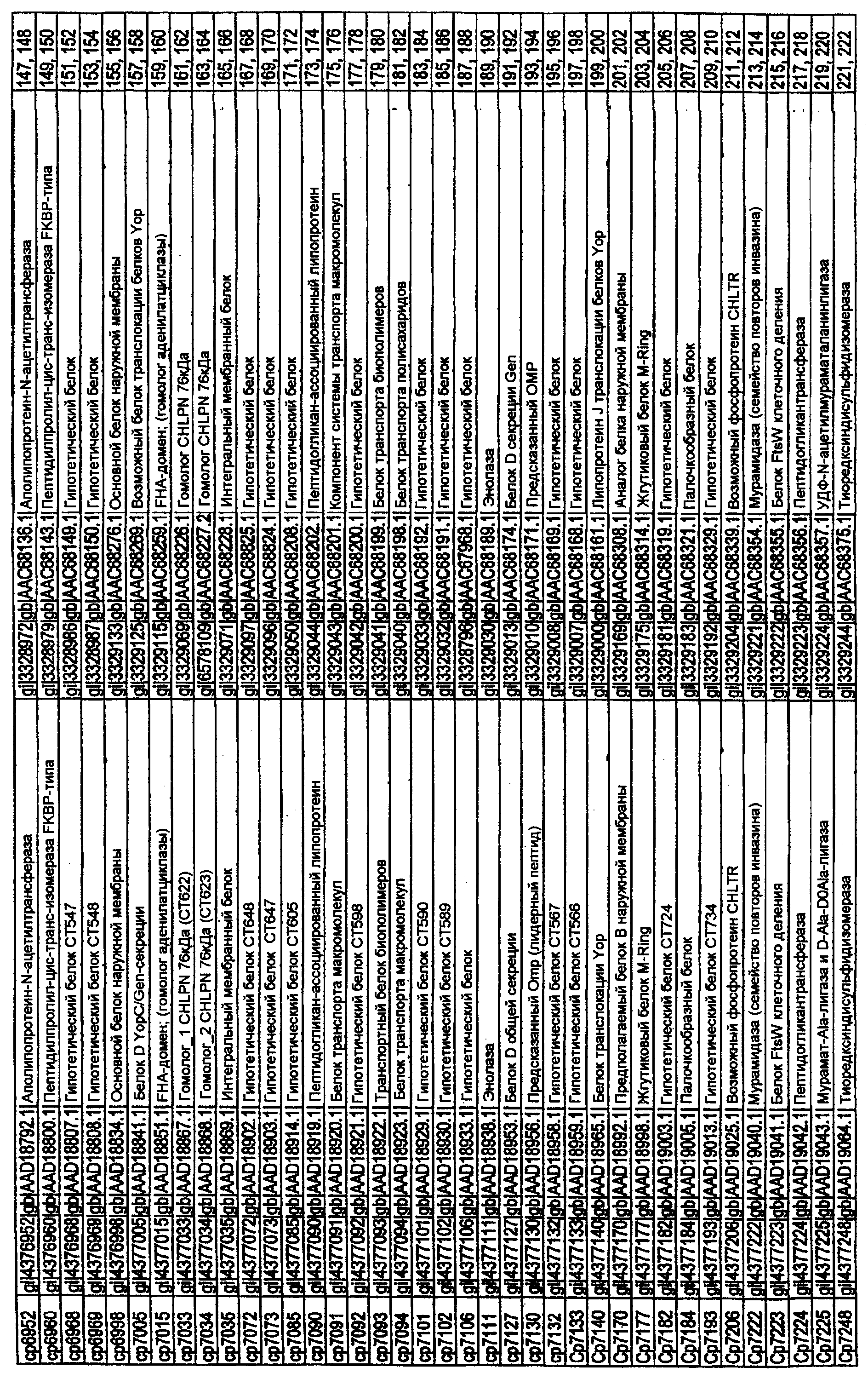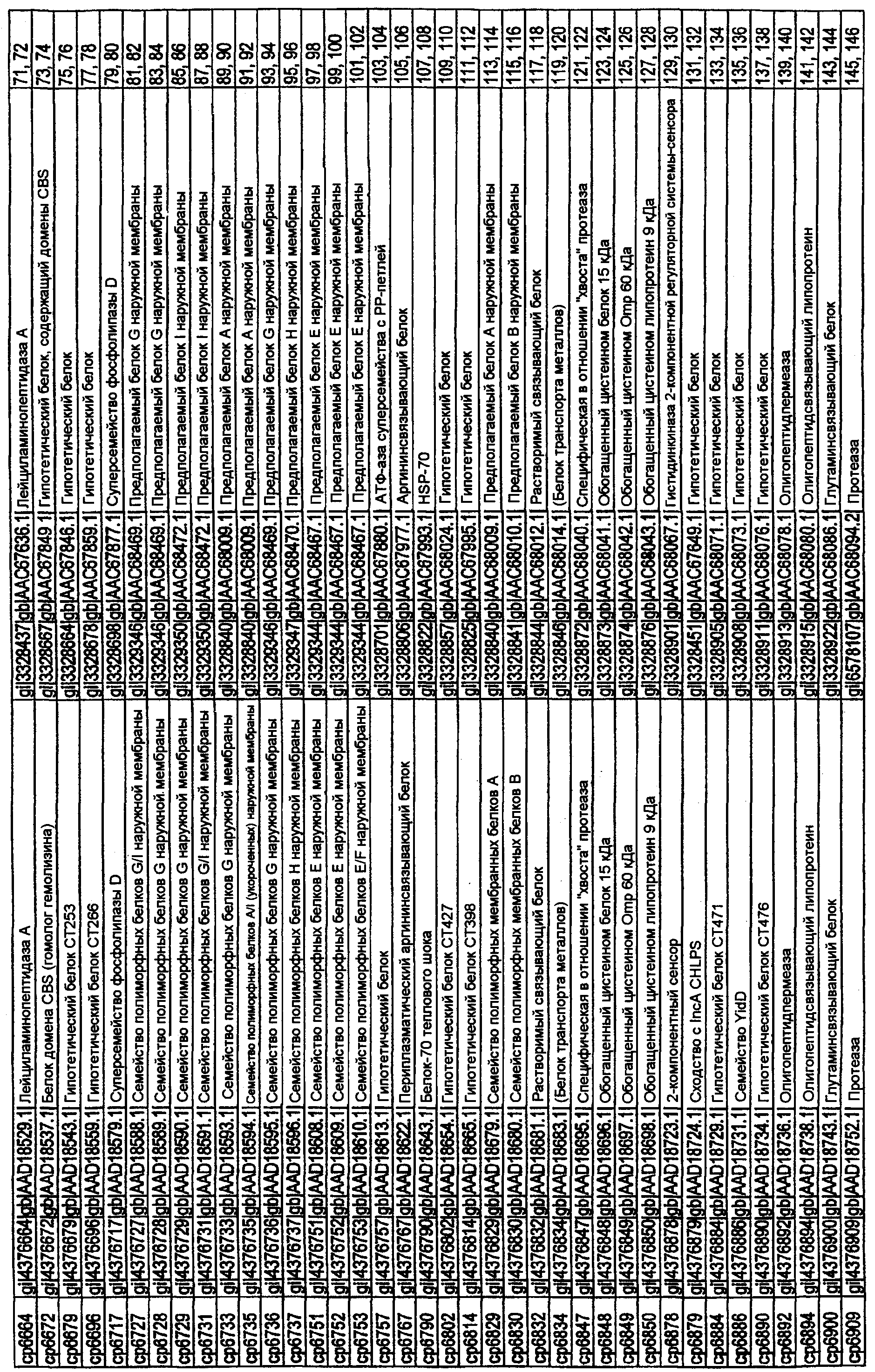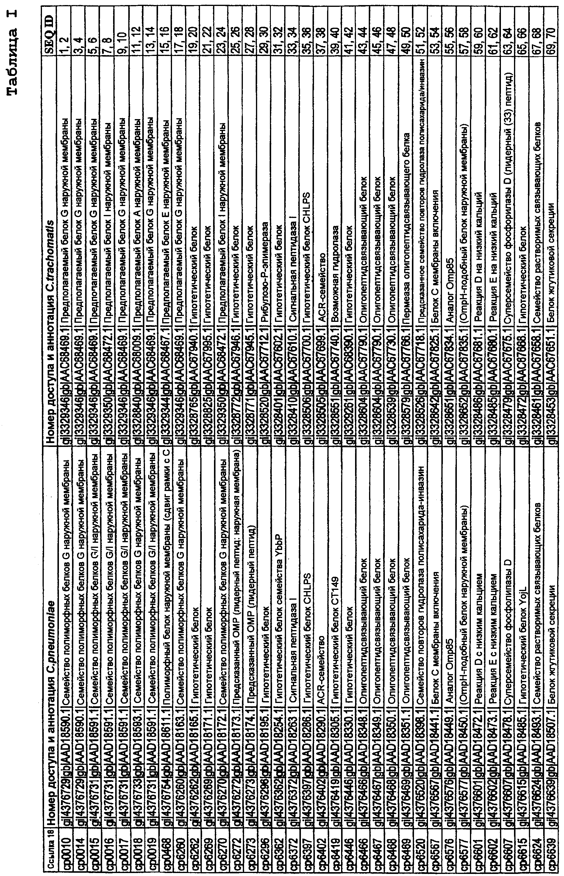 Данное изобретение относится к белкам С. trachomatis (SEQ ID NO:1-261 с нечетными номерами), которые соответствуют белкам С. pneumoniae, описанным в ссылке 18. Эти белки могут быть использованы в лечении или предупреждении инфекции, вызываемой бактериями Chlamydia, в частности С. trachomatis. Особенно предпочтительными белками являются белки, снабженные примечанием “гипотетический белок” (см. таблицу I в данном описании), или которые считали ранее белками, имеющими цитоплазматическую локализацию.
