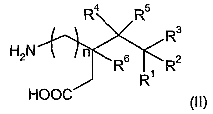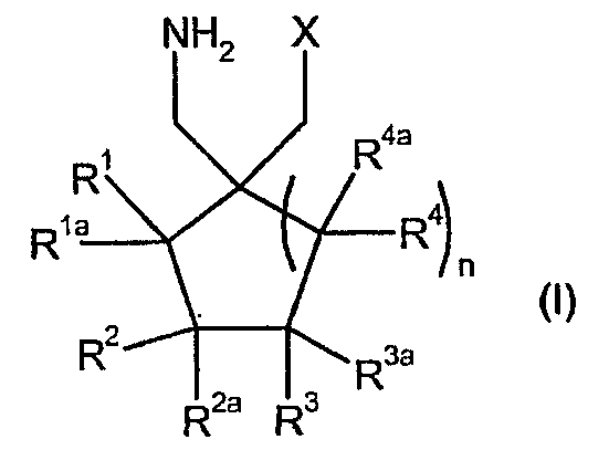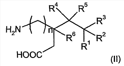 В формуле (I), предпочтительно, R1, R1a, R2а, R3a, R4 и R4a представляют собой H, а R2 и R3 независимо выбраны из H и метила, или R1a, R2а, R3a и R4a представляют собой H, и R1 и R2 или R2 и R3 вместе образуют С4-C5 циклоалкильное кольцо, или, если n равно 0, то R1, R1a, R2а, R3a, R4 и R4а представляют собой H, а R2 и R3 образуют циклопентильное кольцо, или, если n равно 1, то R1, R1a, R2a, R3a, R4 и R4a представляют собой H, а R2 и R3 оба являются метилом, или R1, R1a, R2а, R3a, R4 и R4a представляют собой H, а R2 и R3 образуют циклобутильное кольцо или, если n равно 2, то R1, R1a, R2, R2a, R3, R3a, R4 и R4а представляют собой H, или, если n равно 0, R1, R1a, R2a, R3a, R4 и R4а представляют собой H, а R2 и R3 образуют циклопентильное кольцо. Ациклические альфа-2-дельта лиганды, которые используются по настоящему изобретению, проиллюстрированы следующей формулой (II):
