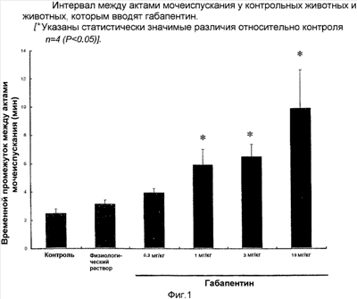 Эффект прегабалина на функцию мочевого пузыря исследовали на модели определения функции мочевого пузыря с телеметрией у крыс. В этой модели прегабалин продемонстрировал зависимое от дозы повышение среднего объема на акт мочеиспускания в течение двух часов (фиг.4) и соответствующее снижение частоты мочеиспускания. Общий объем при мочеиспускании в течение двух часов оставался неизменным для всех доз. Давление мочевого пузыря при мочеиспускании также оставалось неизменным по сравнению с контролем для всех доз. Таким образом, какой-либо эффект на давление в мочевом пузыре не был подвержен.