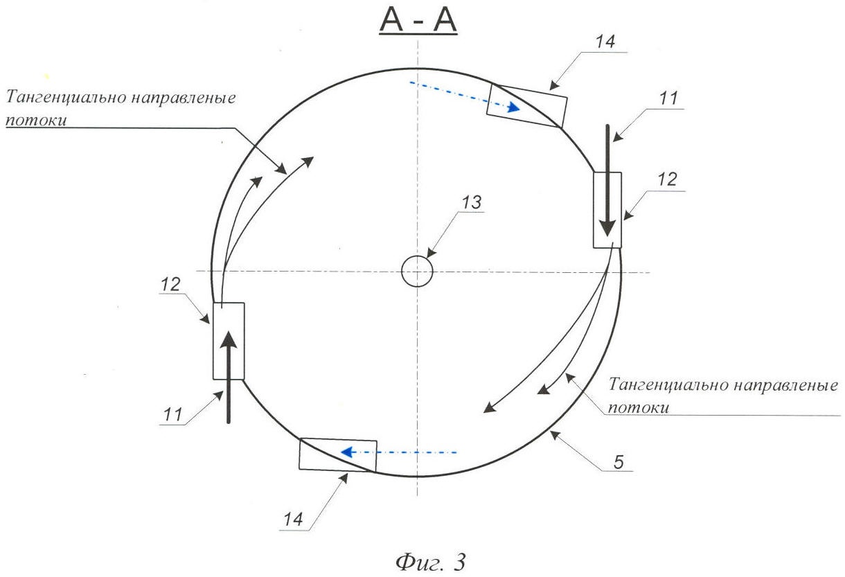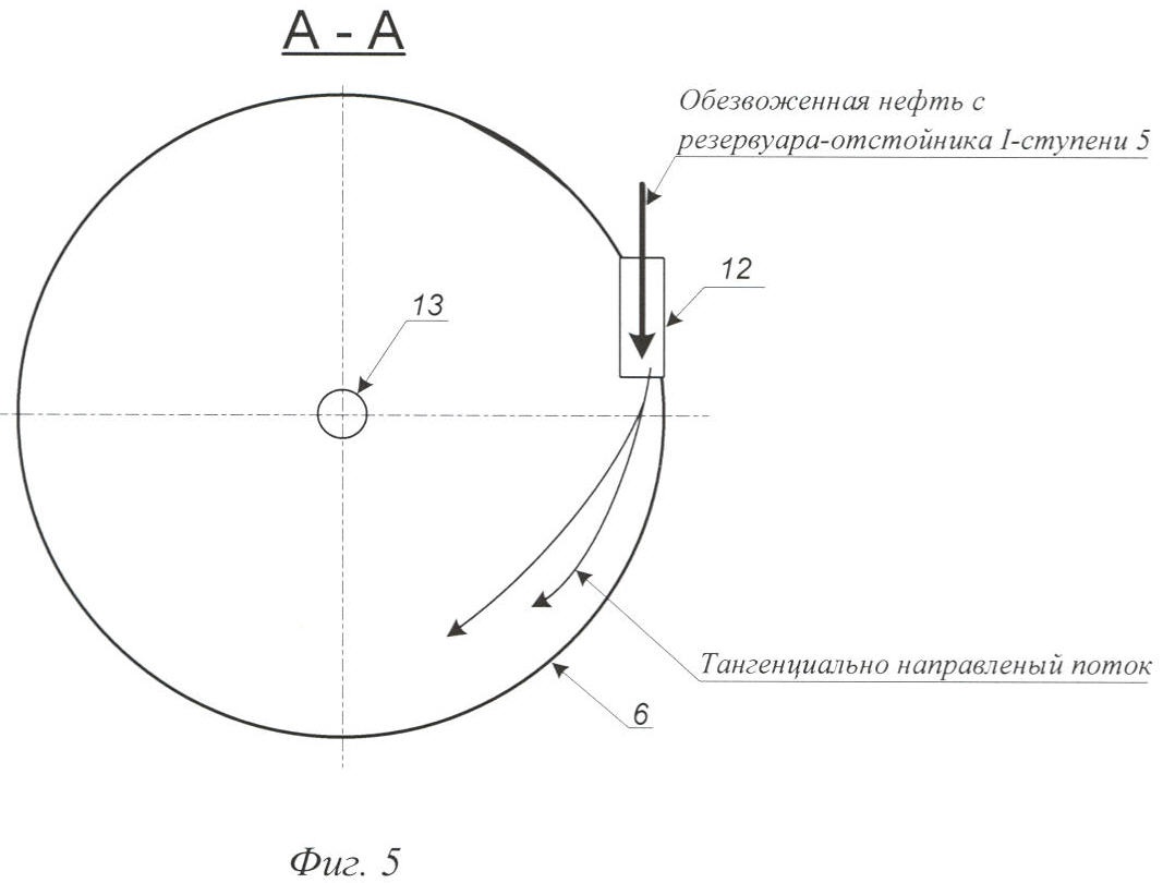 Добываемая жидкость определенной обводненности поступает по напорному трубопроводу 1 в трубную часть теплообменника 2, где нагревается потоком товарной нефти и по коллектору расчетного диаметра в ламинарном режиме направляется в печь 3, где нагревается до определенной температуры, и далее поступает в нефтегазосепаратор 4, являющийся второй ступенью сепарации, где происходит отбор основного количества газа. Газ под давлением подается на установку сероочистки газоперерабатывающего завода (УСО ГПЗ). Отсепарированная нефть в ламинарном режиме поступает в ДПЖ 10, где происходит деление потока жидкости на n (где n 1). Далее жидкость в ламинарном режиме по n трубопроводам 11 расчетного диаметра вводится на расчетной высоте h1 (фиг.2) в тело резервуара-отстойника первой ступени 5. Ввод потоков жидкости (фиг.3) осуществляется равноудаленно по всей длине окружности резервуара-отстойника первой ступени 5 через сопла 12, формирующие горизонтальные тангенциально направленные струи непосредственно у его стенок, что обеспечивает максимальное использование кинетической энергии потока жидкости и вращение всей ее массы в резервуаре-отстойнике первой ступени 5 в заданном направлении.