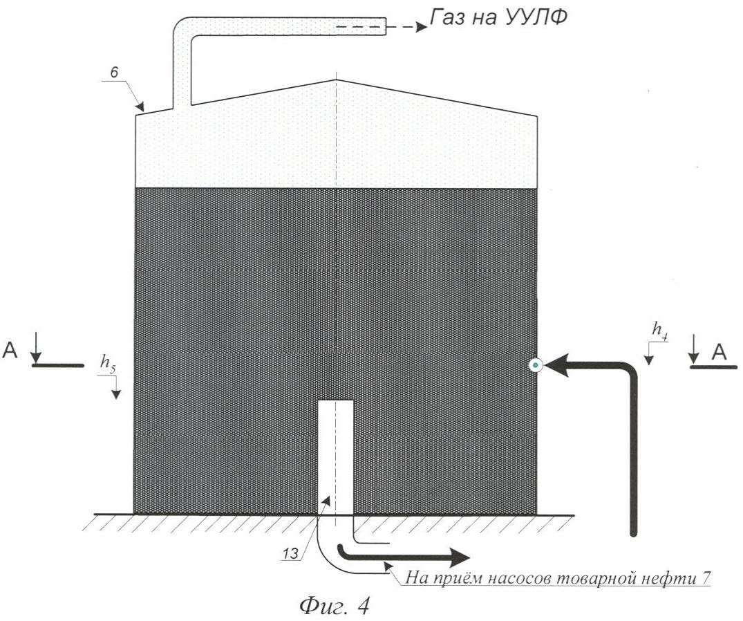Товарная нефть с расчетной высоты h5 (фиг.4) отбирается по сливному трубопроводу 13 расчетного диаметра, установленному вертикально в центре товарного резервуара второй ступени 6, направляется в ламинарном режиме на прием насосов товарной нефти 7 (фиг.1) и далее в межтрубную часть теплообменника 2 для нагрева поступающей в резервуар-отстойник первой ступени 5 добываемой жидкости. Охлажденная до определенной температуры товарная нефть с помощью насосов товарной нефти 7 (по пути движения отстойники отсутствуют) через узел учета направляется в головные сооружения потребителя.