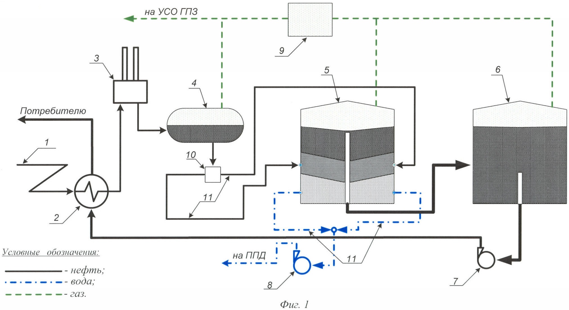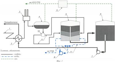 Подтоварная вода из нижней зоны товарного резервуара второй ступени 6 периодически насосом возвращается в голову процесса (не показан), тем самым создавая замкнутый и герметичный цикл подготовки продукции скважин.