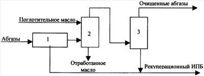 Поток абгазов после колонны окисления ИПБ поступает в холодильник-сепаратор 1, где при повышенном давлении происходит отделение капельной влаги и снижение концентрации ИПБ до равновесной концентрации его паров. Затем абгазы поступают в абсорбер 2, где за счет обработки жидким поглотителем из них удаляется основная часть оставшихся примесей. На заключительном этапе абгазы поступают на доочистку в периодический адсорбер 3, заполненный композиционным адсорбентом, где происходит удаление из абгазов остаточных органических примесей.