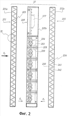 Структура фильтра 20 более детально представлена на фиг.2 и 4. Этот фильтр включает две фильтрующих секции 201 и 202, внутри которых расположены соответственно ленты фильтрующего средства 203 и 204.