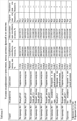 Наличие в сырье цеолита типа фожазит с каркасной структурой создает в адсорбенте набор сильных центров адсорбции, доступных для углеводородов с большой молекулярной массой, характерных для нефтяных масел. Измельчение сырья на аппаратах с нагрузкой на материал предпочтительно ударного типа дает возможность увеличить доступность центров адсорбции цеолита, не закрывая их продуктами помола путем истирания. Сырье перед измельчением обрабатывают водой или водяным раствором поверхностно-активного вещества для повышения эффективности процесса измельчения. В качестве целевых фракций отделены фракция №1 и фракция №3, а также отход (менее 0,3 мм). Оставшийся материал (фракция 1,5-3,0 мм и более 5,0 мм) обработали водой (рН 6,0) и пропустили через устройство типа дезинтегратор, где произошло измельчение под действием нагрузок ударного типа. Измельченный материал рассеяли на фракции, как указано выше. Получено