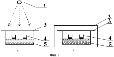 На фиг.1 приведено схематичное изображение устройства, в котором в статических условиях проводились процессы сорбции и десорбции в отсутствие облучения и при облучении видимым светом или УФ-излучением: а) – при облучении; б) – в отсутствие облучения. Цифрами обозначены: 1 – источник излучения; 2 – черная непроницаемая для излучения защитная оболочка; 3 – стеклянный эксикатор с гладкой крышкой; 4 – стеклянный контейнер (бюксы) со слоем исследуемого материала – сорбента; 5 – адсорбат в жидком состоянии в эксикаторе, обеспечивающий генерацию паров сорбируемых молекул в газовую фазу.