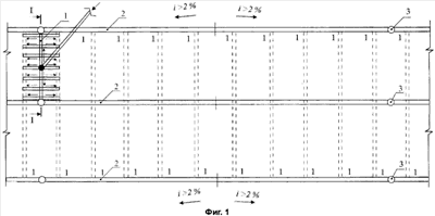 Способ поясняется чертежами. На фигурах 1, 2, 3 соответственно представлены: план оконтуренных дренажными канавами, приемными шурфами загрязненных участков; вертикальный разрез по I-I нагнетательных труб и продольный разрез очистной установки. Способ предусматривает проведение рекультивационных работ в три этапа.