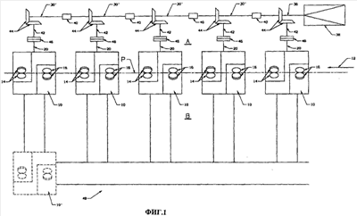 Вал 30 может быть удлиненным, но предпочтительно, чтобы он был бы разделен на сегменты 36′, соединенные муфтами сцепления 40. Каждый сегмент 36′ вала соединен с выходным валом 42 с помощью конической зубчатой передачи 44. Выходные валы 42 параллельны и проходят в сторону от вала линии подачи заготовок. Муфты сцепления 40 являются регулируемыми, обеспечивая механическое соединение или разъединение соответствующих сегментов валов.