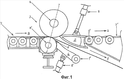 Стрелка 5 выполнена на своих верхней и нижней сторонах выпуклой и способна, таким образом, плотно прижиматься в приподнятом положении к верхнему тянущему ролику 4, выполняя функцию скребка. Направляющий стол 6 выполнен в соответствии с нижней стороной стрелки 5 вогнутым с целью прилегания с геометрическим замыканием, тогда как его свободный конец выполнен для прилегания также с геометрическим замыканием к нижнему тянущему ролику 4′. Таким образом, направляющий стол 6 отвечает требованию к дополнительному функционированию в качестве скребка на нижнем тянущем ролике 4′.