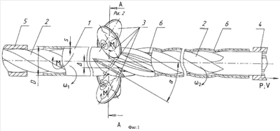 Под действием указанных сил происходит поступательное перемещение оправки 2 и трубы 1 при одновременном их вращении в сторону разворота винтового канала оправки. Вращение трубы и оправки происходит за счет углового расположения роликов относительно оси трубы и определяется направляющим вектором результирующего усилия сложения сил на винтовой поверхности канала оправки.