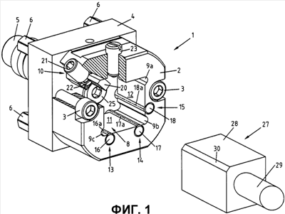 Тело 28 обрабатываемой детали 27 предпочтительно имеет скошенный край 30, зацепляемый упорной планкой 20 неположительным или, при необходимости, положительным образом. При помощи этой скошенной части 30 также определяется правильная угловая ориентация тела 28 по отношению к зажимному корпусу, т.е. тело 28 нельзя вставить в зажимной корпус 2 в положении, повернутом на 90, 180 или 270°, относительно правильной ориентации.