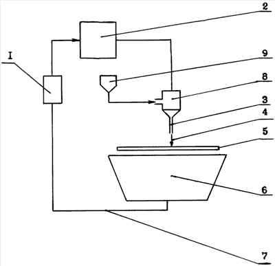 На чертеже представлен вариант реализации предложенного устройство, где 1 – блок повышения давления жидкости; 2 – холодильная камера для охлаждения рабочей жидкости; 3 – выходное сопло; 4 – струя жидкости (льда); 5 – обрабатываемый материал, устанавливаемый над ловушкой 6, 7 – трубопровод возврата жидкости в устройство 1, 8 – инжектор, 9 – емкость с абразивом.