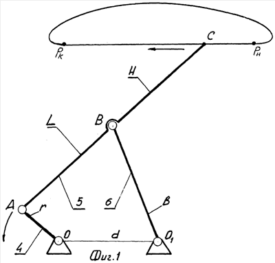 При упомянутых относительных длинах звеньев и плеч шатуна 5 точка на свободном конце плеча Н (точка связи передаточного и исполнительного механизмов) в периоде полного оборота кривошипа 4 описывает замкнутую плоскую траекторию (фиг.1). В интервале прямого хода механизма эта траектория представляет собой прямую линию Рн Рк, а при обратном ходе она является кривой, связывающей концы прямолинейного участка.
