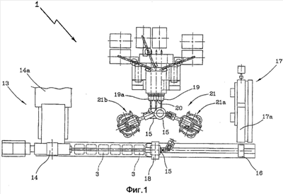 Более конкретно, роботизированная рука 21а, 21b после установки основного барабана 15 в заданное положение так, чтобы обеспечить возможность введения каркасной конструкции 3 в контакт с ним, переводит сам барабан в положение, в котором он будет располагаться соосно элементу 18 для транспортирования брекерной конструкции 4. Когда будет осуществлено наложение брекерной конструкции 4 на каркасную конструкцию 3, после придания тороидальной формы каркасной конструкции 3, роботизированная рука 21а, 21b захватывает основной барабан 15 с одновременным простым перемещением его в положение перед возможным вспомогательным подающим элементом 19а, предназначенным для образования подложки, и после в положение перед первым подающим элементом 19, под действием которого завершается образование протекторного браслета 5.