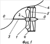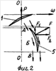На чертеже Фиг.2 изображено по одной лопасти винта и направляющего аппарата и показано их взаимодействие между собой и с окружающей средой (в данном случае с водой). Лопасть винта 1 при вращении отбрасывает струю воды с созданием тяги Р и при этом приводит эту струю во вращение вокруг линии оси О-О движителя. Возникающие при этом центробежные силы оказывают на струю воды воздействие, направленное в боковые радиальные стороны от линии оси О-О. На создание кругового движения в струе воды расходуется энергия силовой установки без создания соответствующей тяги. Искривленные лопасти направляющего аппарата 5 устраняют круговое движение струи воды и направляют ее прямолинейно вдоль линии оси О-О. При этом струя воды (показана стрелками с тонкими линиями) от лопасти винта 1 (положение А) направляется на лопасти направляющего аппарата 5 (положение В) и воздействует на них с силой F, при разложении которой по правилу параллелограмма определяется сила FI, направленная в сторону созданной лопастями винта 1 тяги Р. Возникновение указанной выше равнодействующей силы Р объясняется прямым воздействием струи воды от лопасти винта 1 на лопасть направляющего аппарата 5, а также обтеканием струей воды лопасти направляющего аппарата, имеющего профиль крыла, обеспечивающего создание силы, воздействующей в струе воды на указанную лопасть.