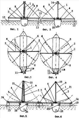 На фи.8 – то же, вид сверху, паруса расположены перпендикулярно продольной оси судна;