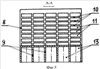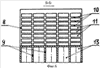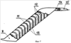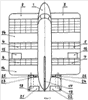 Самолет с реактивными крыльями содержит фюзеляж 1 с пилотским и грузопассажирским отделениями. По бокам фюзеляжа закреплены три пары реактивных полукрыльев 2, 5, 4, 5, 6, 7, одинаковых по конструкции, установленных на одной линии на некотором расстоянии одно от другого. Каждое реактивное полукрыло выполнено в форме прямоугольного короба 8, имеющего продольные 9 и поперечные 10 внутренние перегородки, делящие внутренний объем реактивного полукрыла на отдельные, изолированные друг от друга воздуховоды, каждый из которых имеет воздухозаборник 11, поворотную часть 12 и выходной вертикальный канал 13. Верхняя часть каждого реактивного полукрыла отклонена назад в сторону хвостового оперения так, что передняя кромка прямоугольного короба образует с вертикальной плоскостью угол , равный 45 градусам. В верхней части реактивные полукрылья имеют горизонтальные стабилизаторы 14, на средних из которых установлены элероны 15, 16, связанные с механизмом управления самолетом в поперечной плоскости. В задней части фюзеляжа закреплены вертикальный 17 и горизонтальные 18, 19 стабилизаторы, имеющие рули направления 20 и высоты 21, 22. В задней части фюзеляжа на пилонах 25, 24 закреплены реактивные двигатели 25, 26. В нижней части фюзеляжа установлено посадочное шасси 27 с носовым опорным колесом 28. Работа самолета.