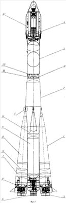 Увеличение рабочего запаса компонентов топлива на блоках первой ступени 1 возможно при применении нового двигателя и новой системы наддува топливных баков, что позволяет исключить из состава блоков два торовых бака (торовые баки азота и пероксида водорода), а освободившееся пространство использовать для размещения дополнительного запаса топлива, при этом бак горючего 7 и нижнее днище 11 бака окислителя смещаются вниз к маршевому двигателю 5, который крепится непосредственно на шпангоуте 12 нижнего днища бака 7 горючего под углом к оси блока 1 первой ступени, равным углу наклона блока 1 первой ступени относительно блока 2 второй ступени, а кронштейны 13 крепления нижних силовых тяг 14 и фиксирующий кронштейн 15, фиксирующий положение блока 1 первой ступени относительно блока 2 второй ступени, расположены на оболочке бака горючего, а на внутренней поверхности выполнен шпангоут 16.