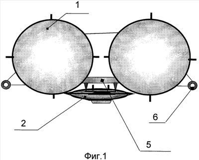 На фиг.1 приведен общий вид спереди на МТКС, состоящей из ТСНС (1) и ВКС (2), пристыкованной снизу к приборной платформе (5) на ТСНС (1), выполненного по схеме катамарана. На нижней части ТСНС (1) размещена ДУ (6) ТСНС;